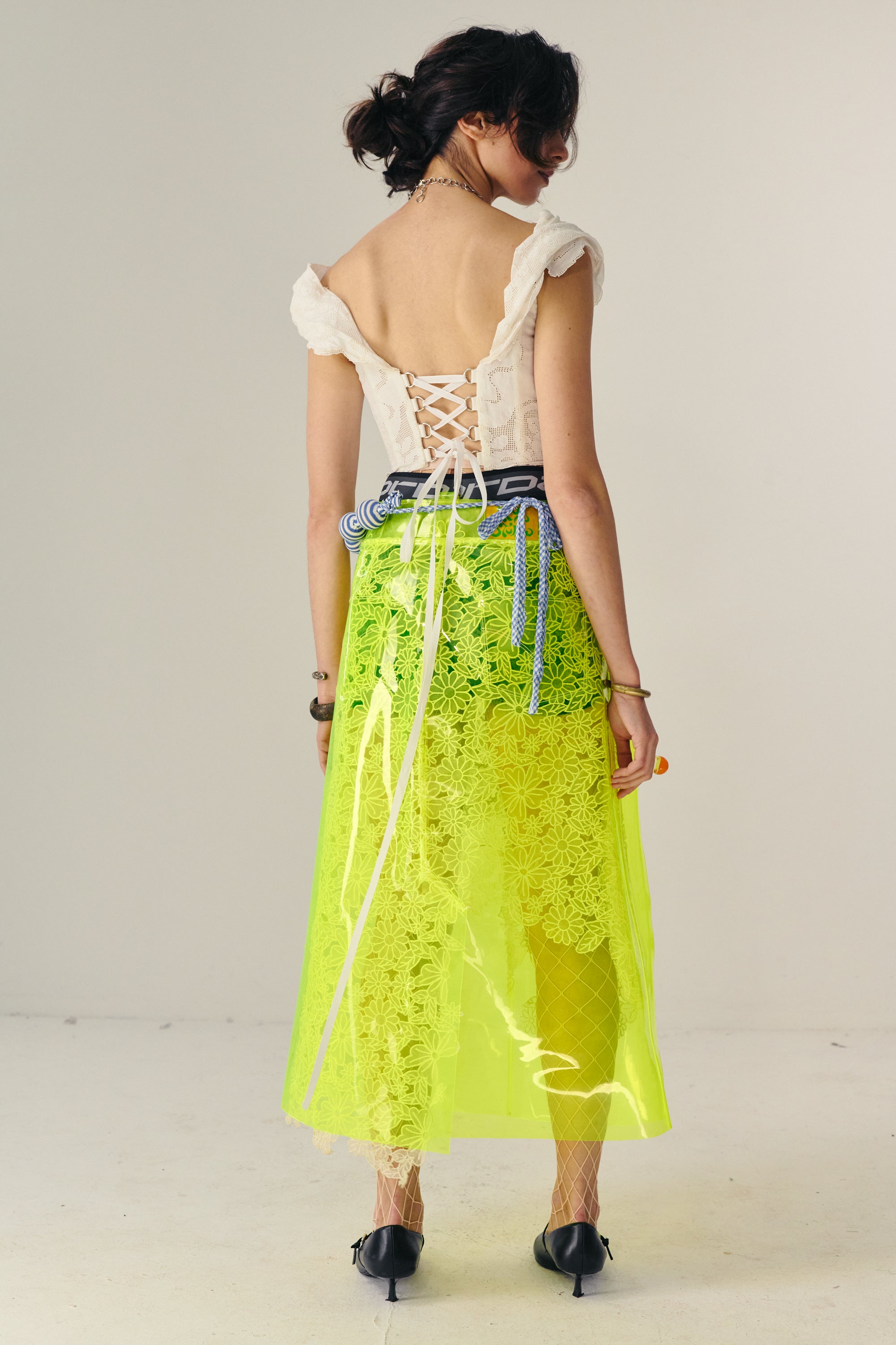 - Denim inspired skirt, with machine-made lace placed asymmetrically underneath the PVC to create a torn denim effect.