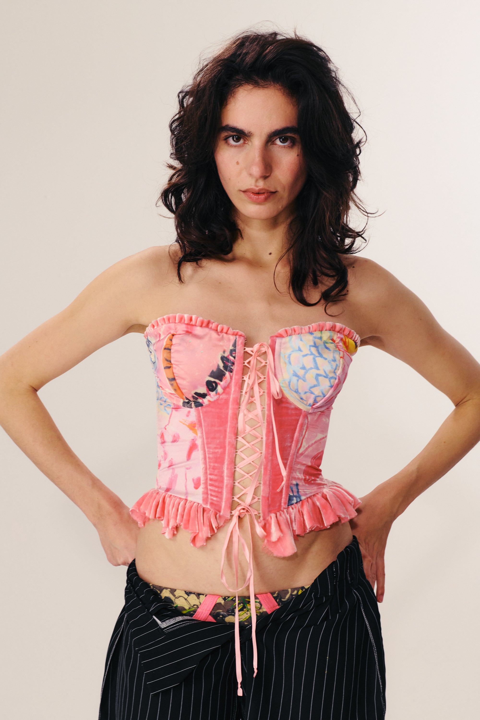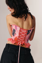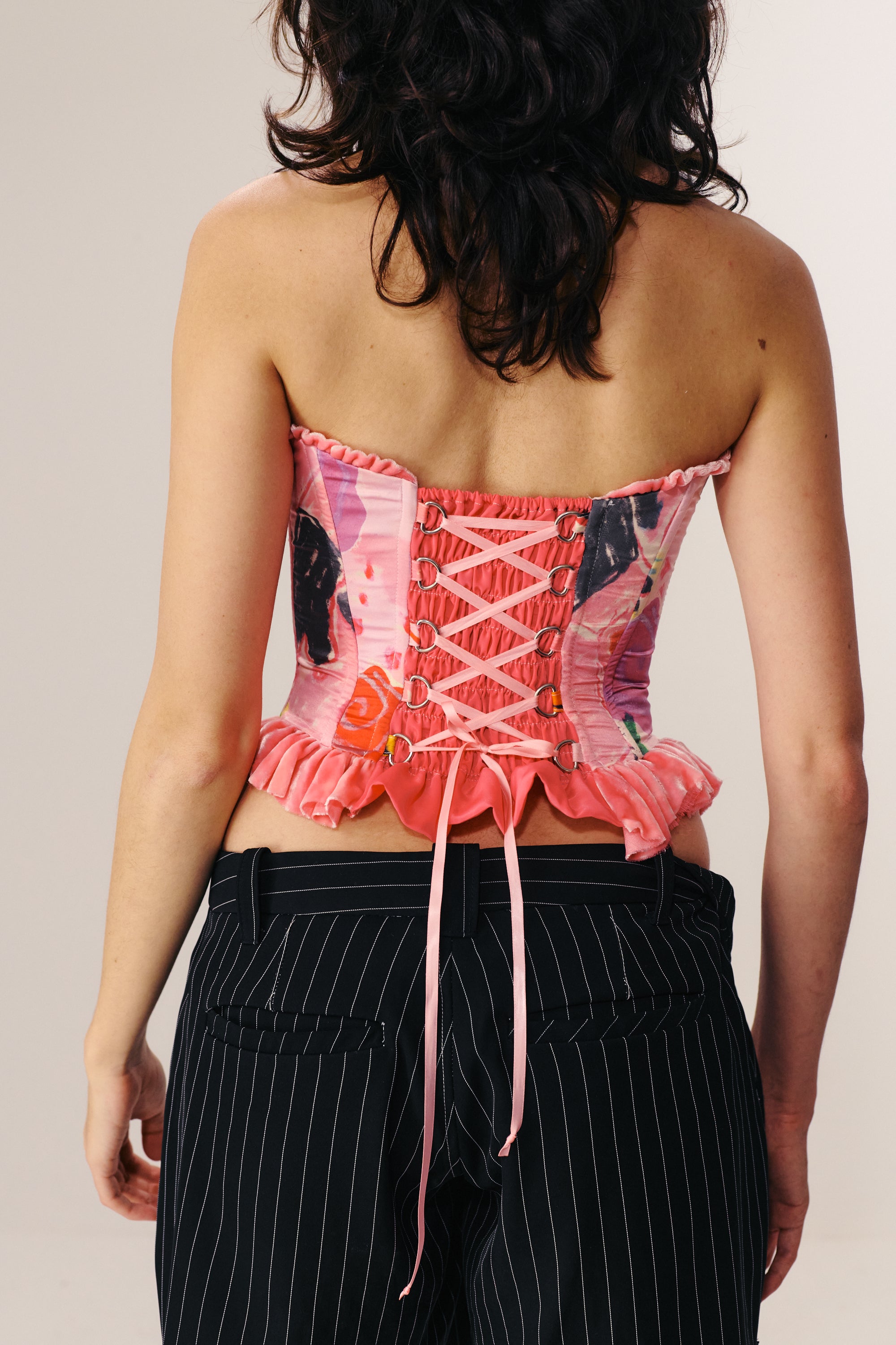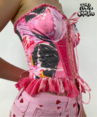 Constructed with both steel and plastic boning, the Itiya Studio corset is fully boned and features metal underwire cups, metal eyelet detailing, and a pink ribbon crossing through the front. Made from luxurious Silk velvet and Sateen, this garment is illustrated by I SCREAM COLOUR and lined with breathable power mesh and cotton. The highly adjustable back fastening ensures a perfect fit for all body types. It is recommended to order your true size, but if unsure, size down. Modeled by Naomi in size XL and dry clean only.