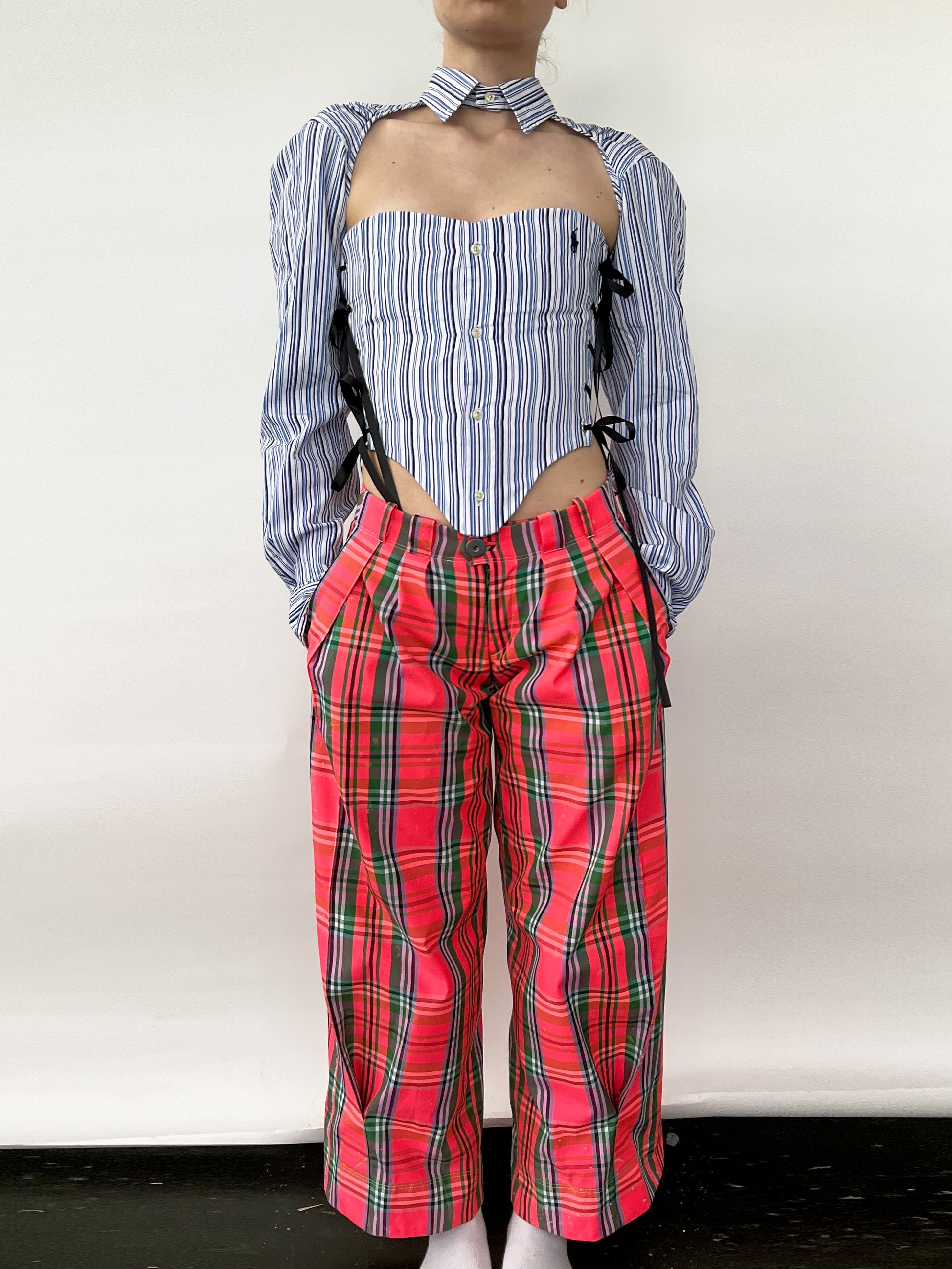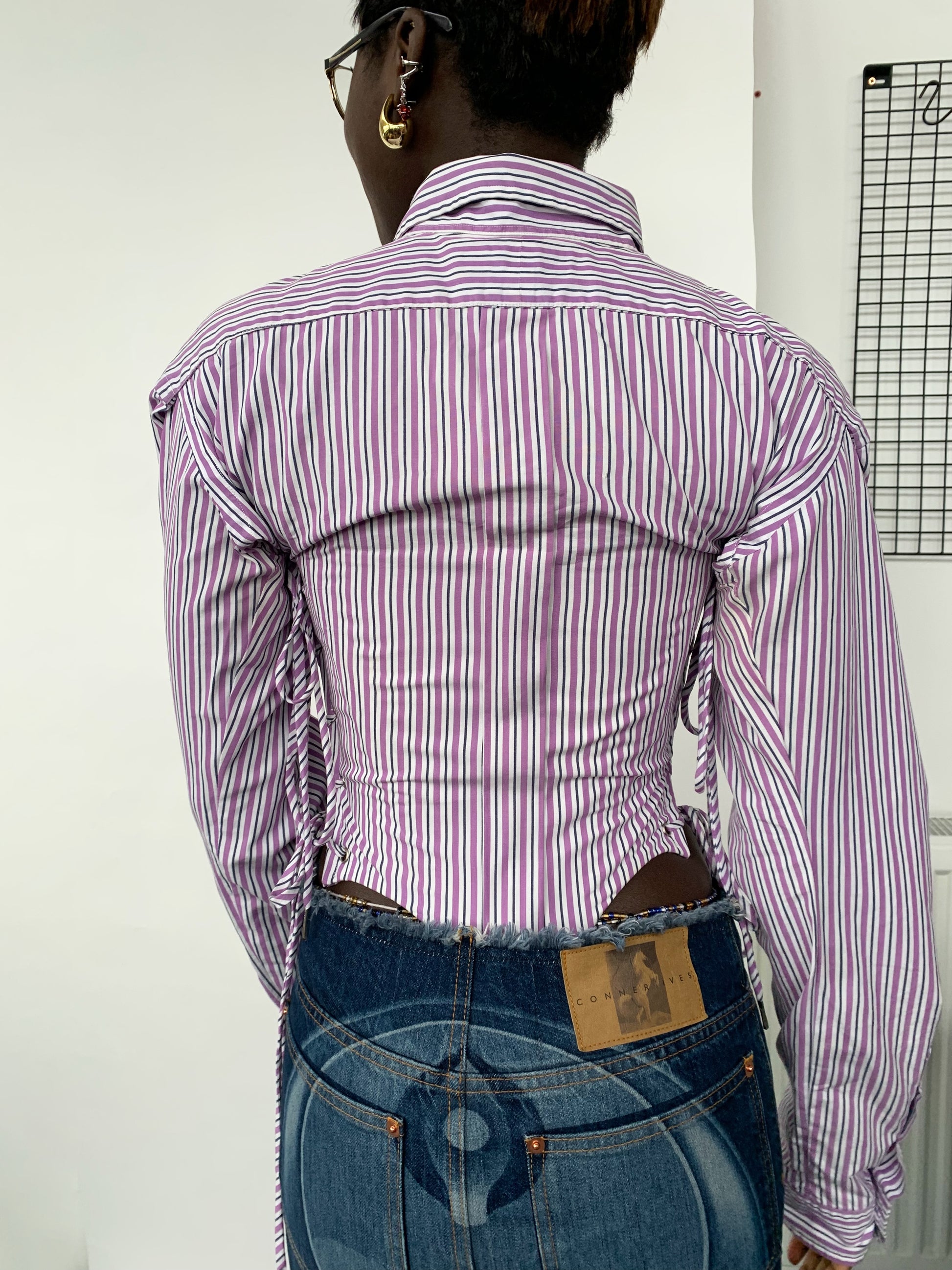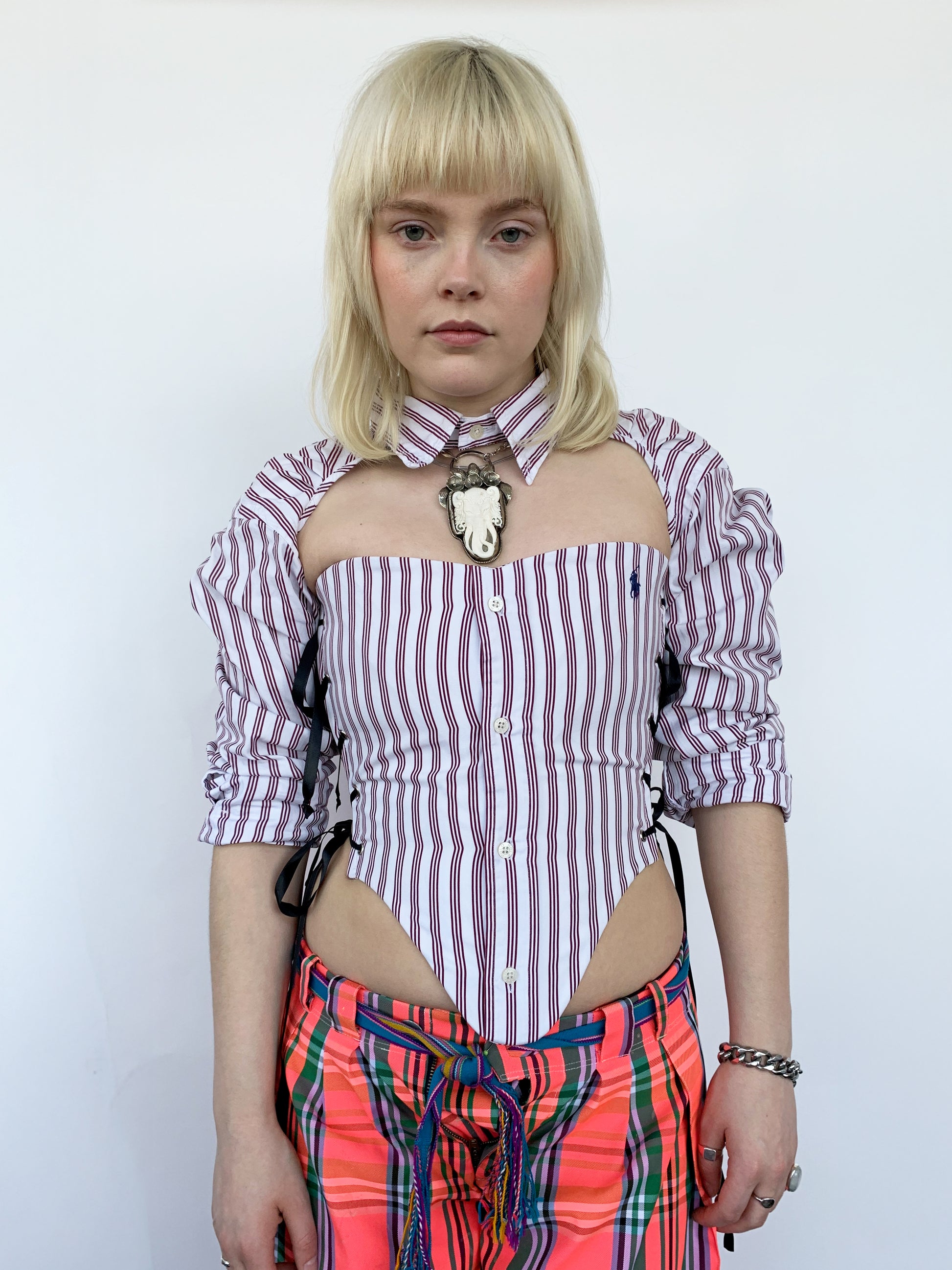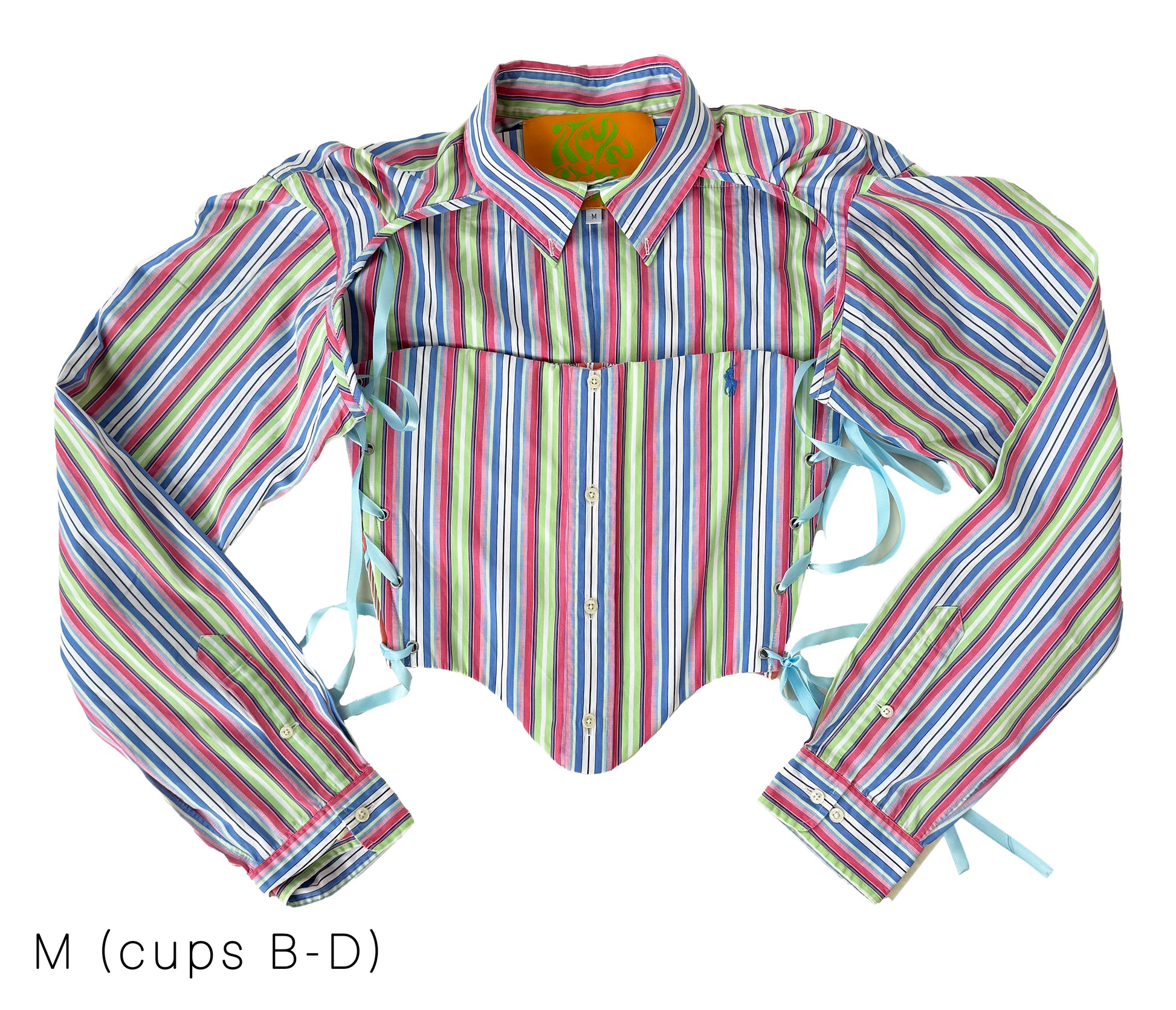 This up-cycled Ralph Lauren shirt corset from Itiya Studio features plastic boning for a flattering fit and metal eyelet detailing for side rib lace-up. The fastening is highly adjustable and can be customized for different body types.