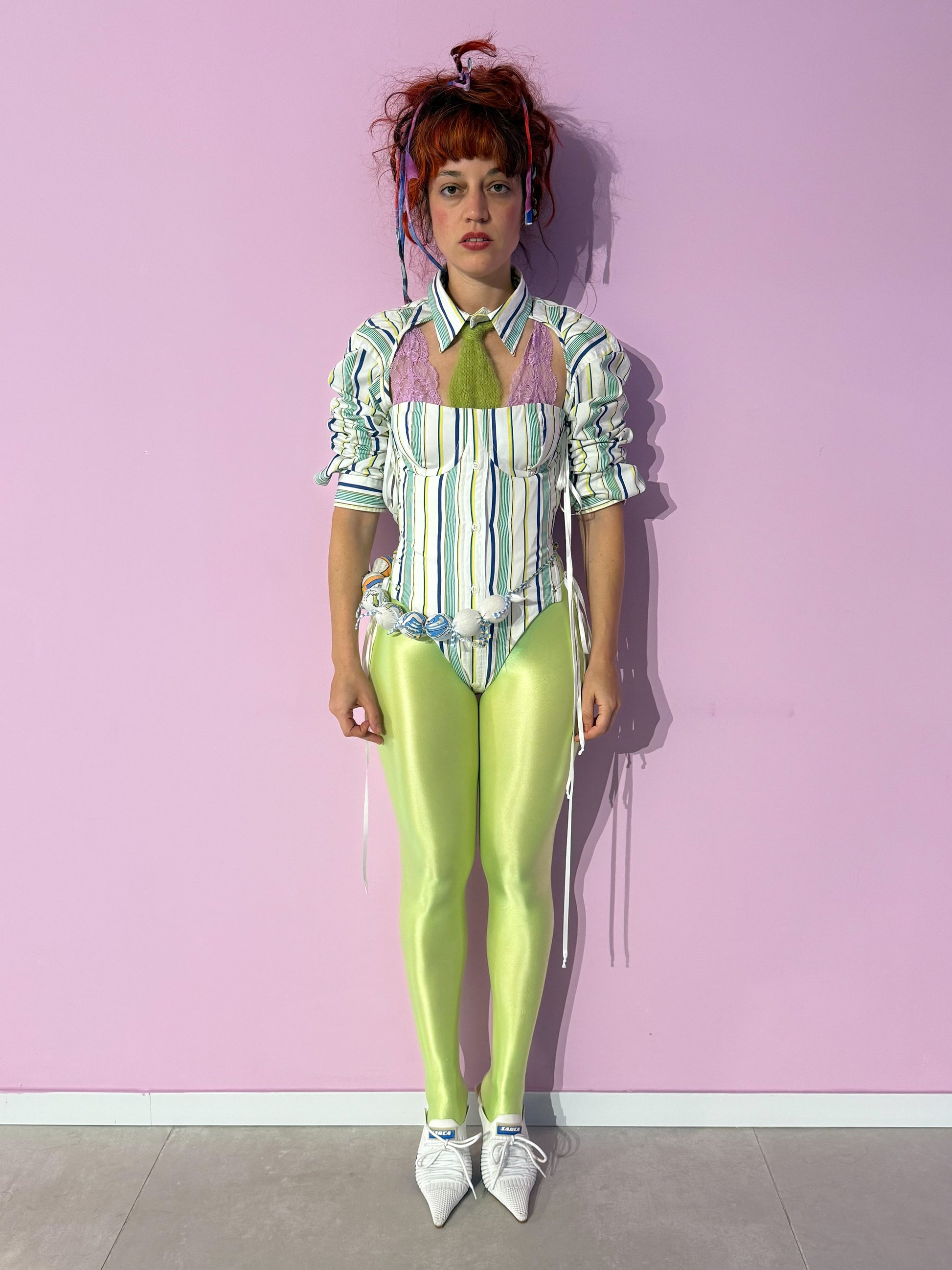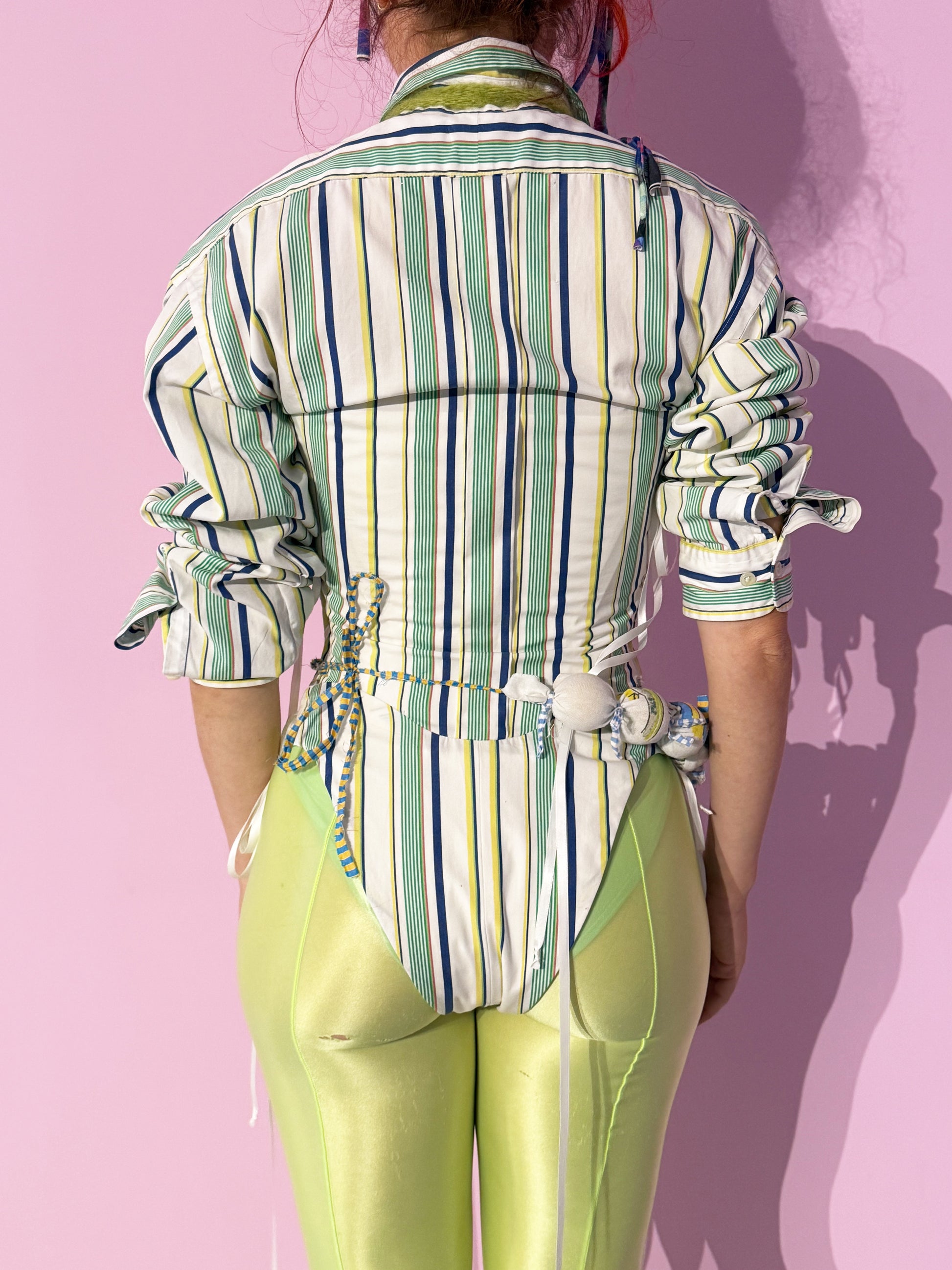 This up-cycled Ralph Lauren shirt corset from Itiya Studio features plastic boning for a flattering fit and metal eyelet detailing for side rib lace-up. The fastening is highly adjustable and can be customized for different body types.