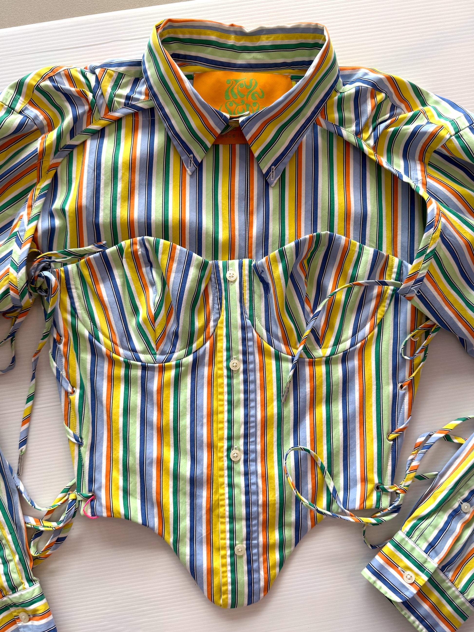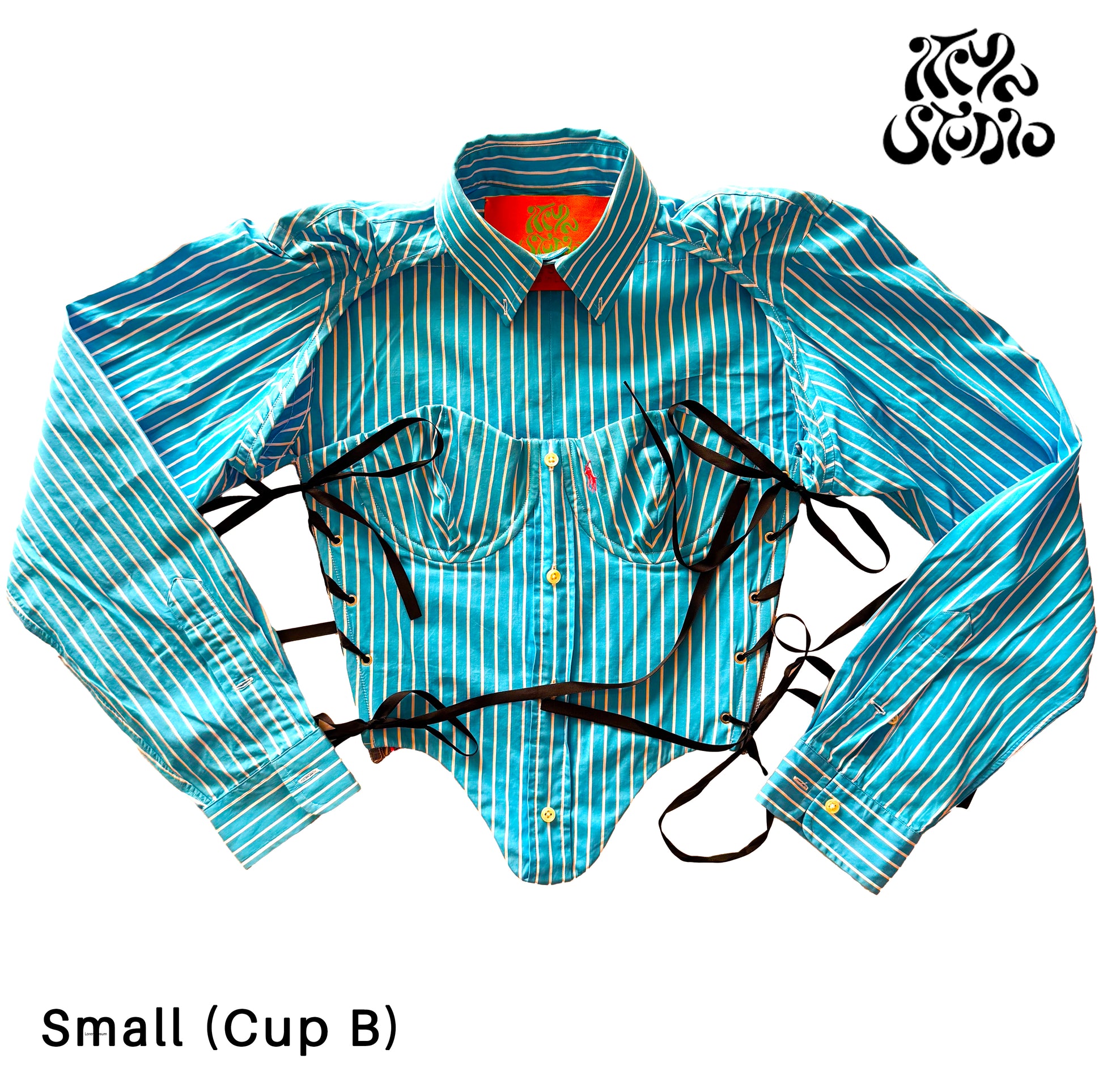 This up-cycled Ralph Lauren shirt corset from Itiya Studio features plastic boning for a flattering fit and metal eyelet detailing for side rib lace-up. The fastening is highly adjustable and can be customized for different body types.