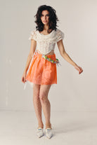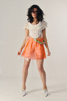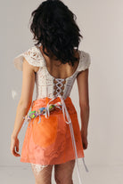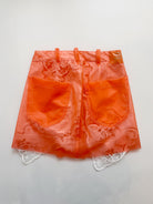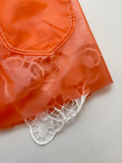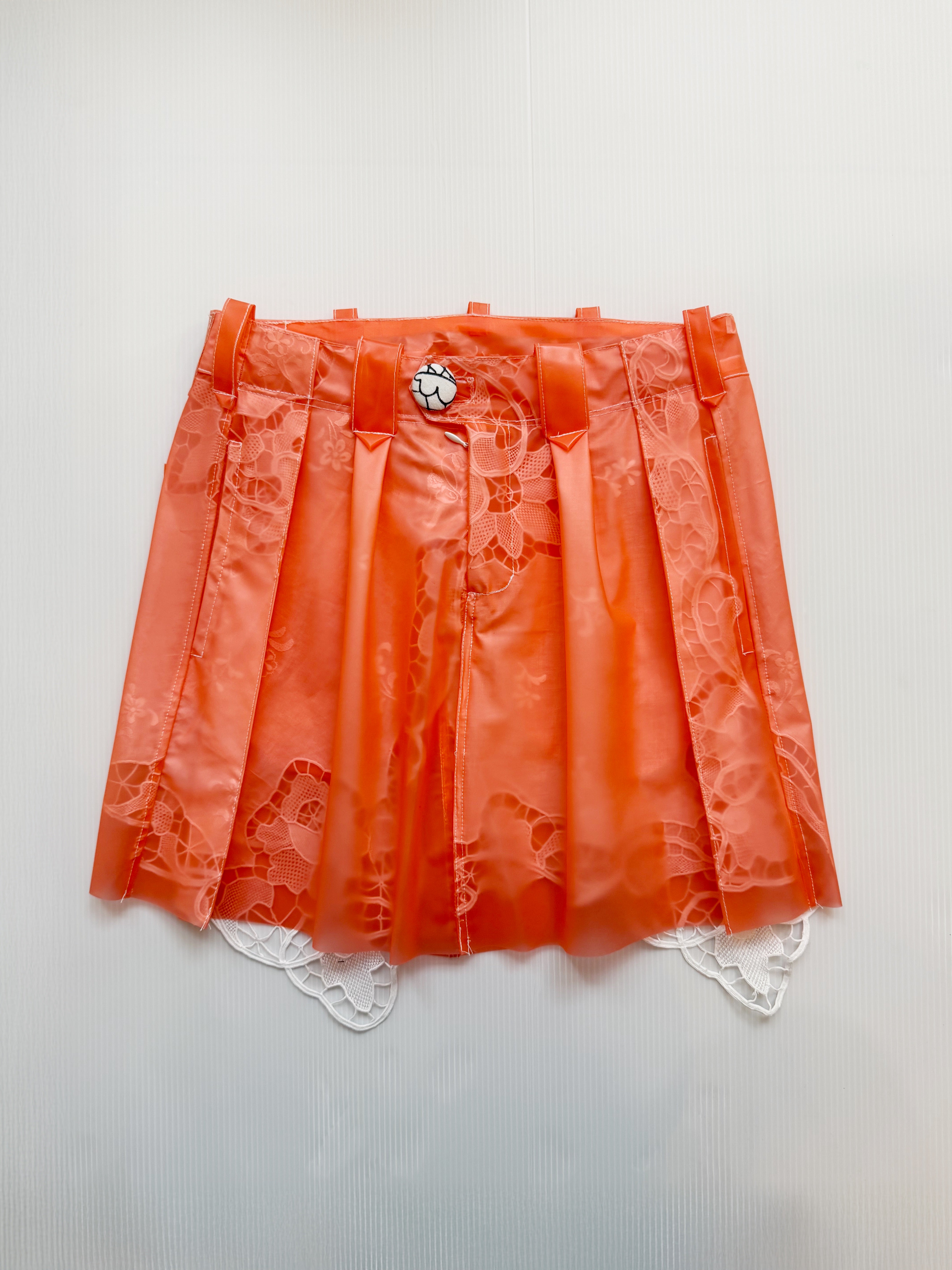 Denim inspired style with machine-made lace put asymmetrically underneath the PVC to create a torn denim effect.